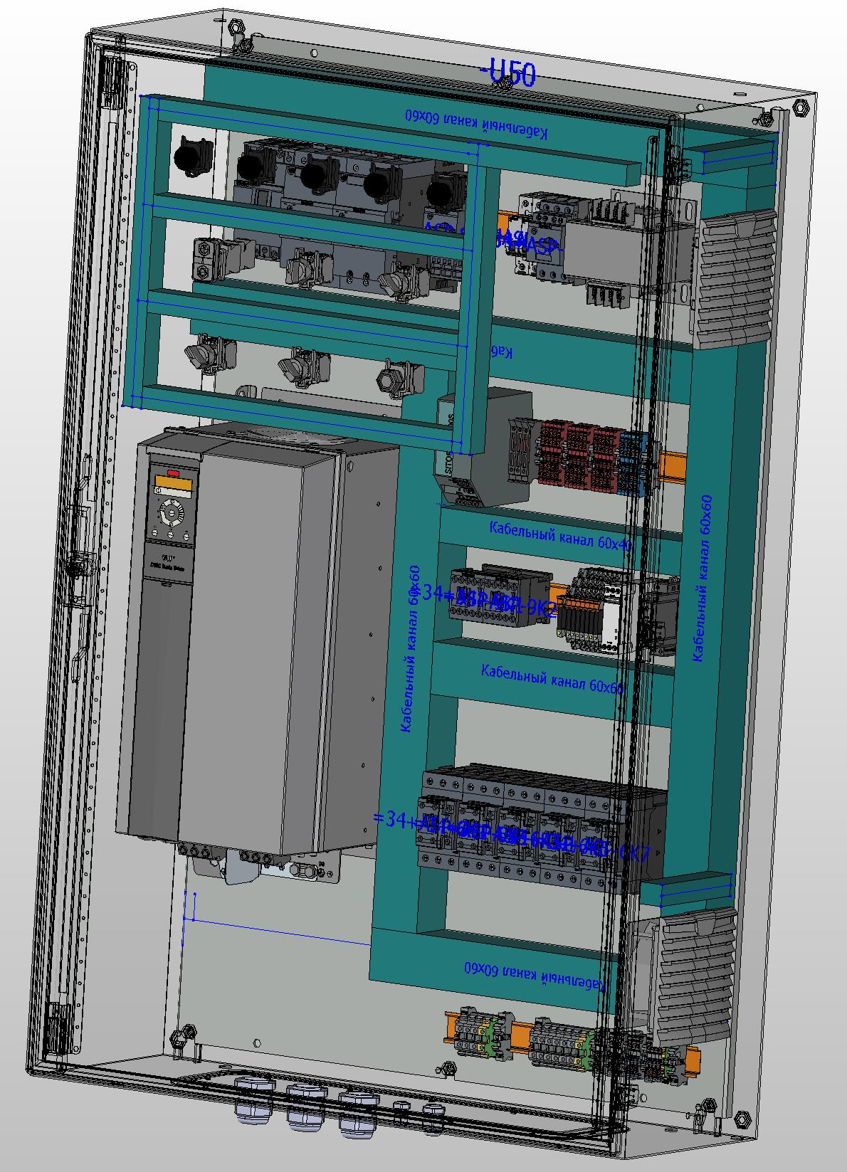 Нужна для визуального восприятия пространства шкафа управления. На базе 3D объекта создается компановка шкафа. Так же нужна для выставления необходимых звзорорв между элементами схемы для лучшей вентиляции. Плюс есть возможность вычислить размер кабель каналов в зависимости от сечения проводов проложенных в них.