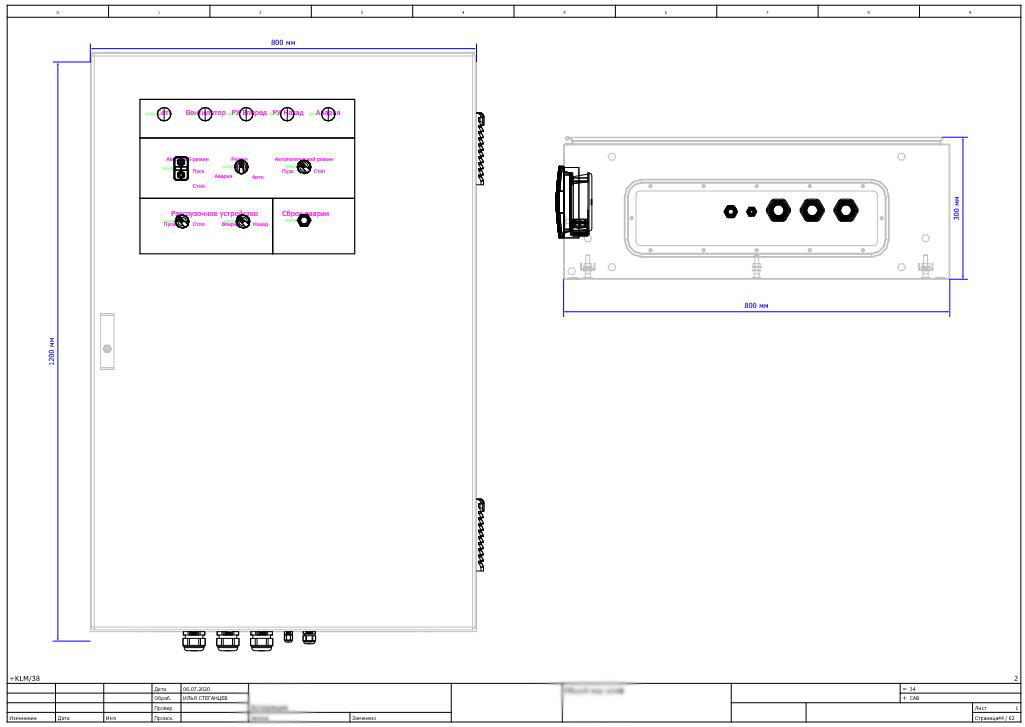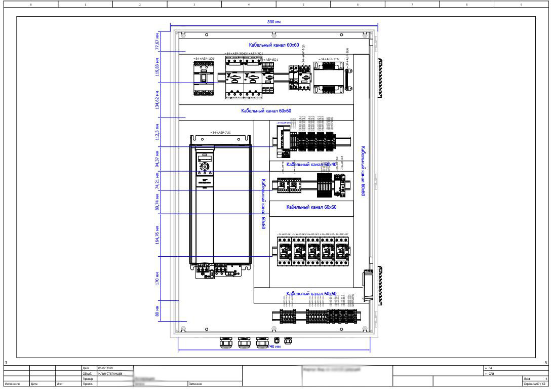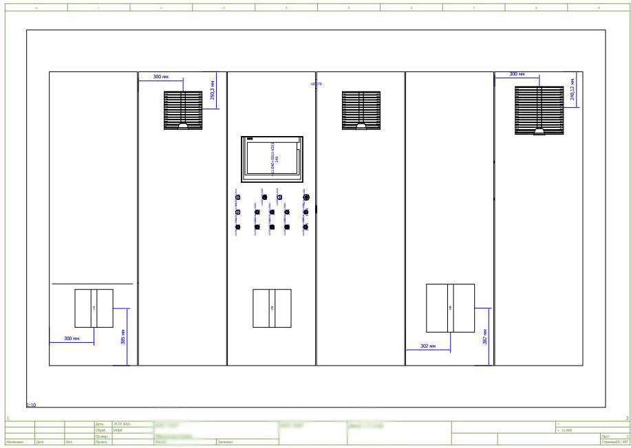 Размещение элементов схемы как внутри так и снаружи шкафов управления, с указанием ключевых размеров.