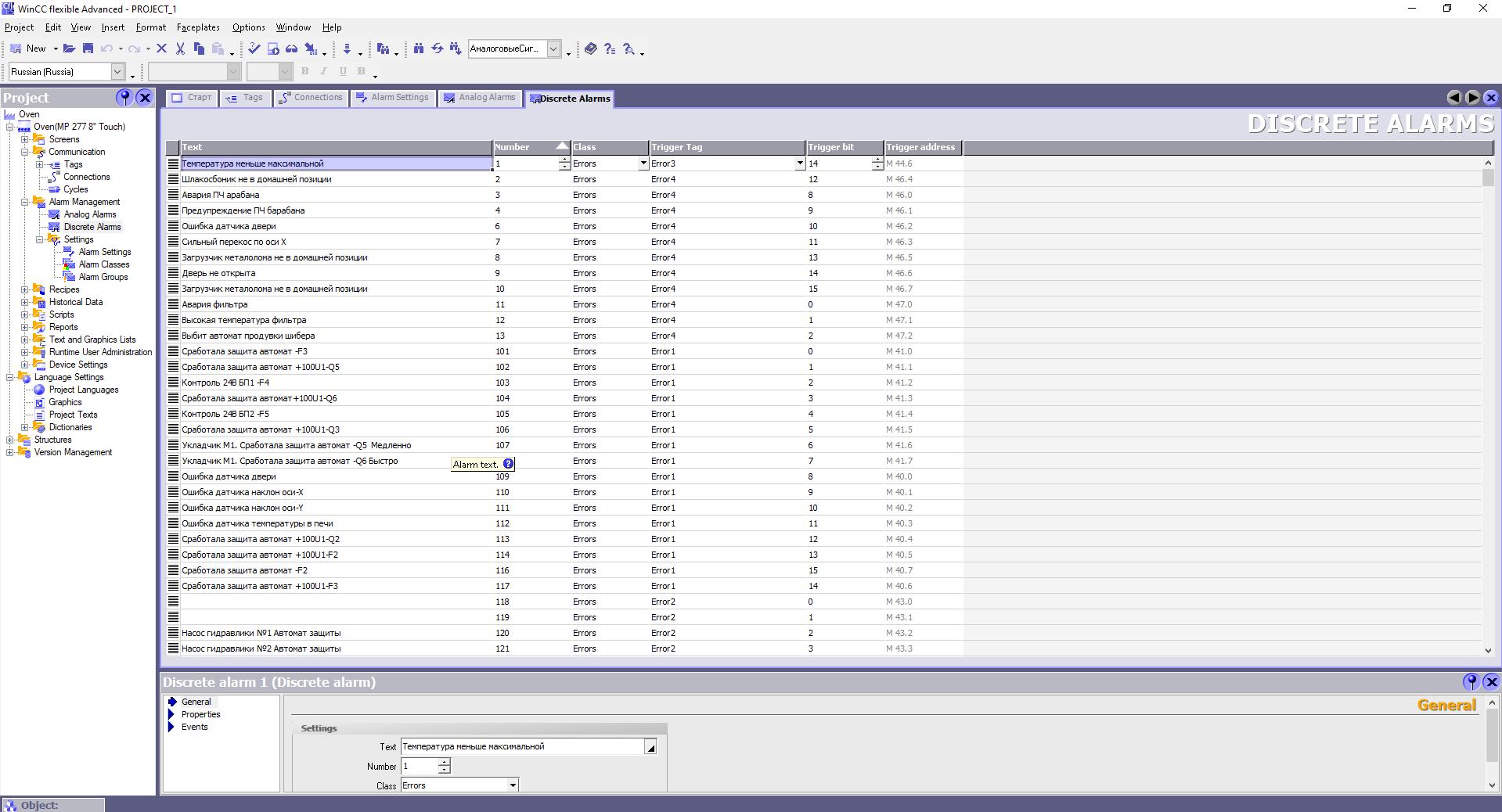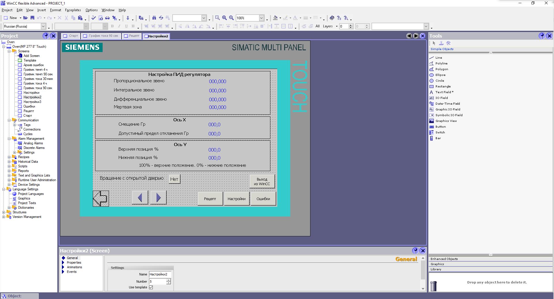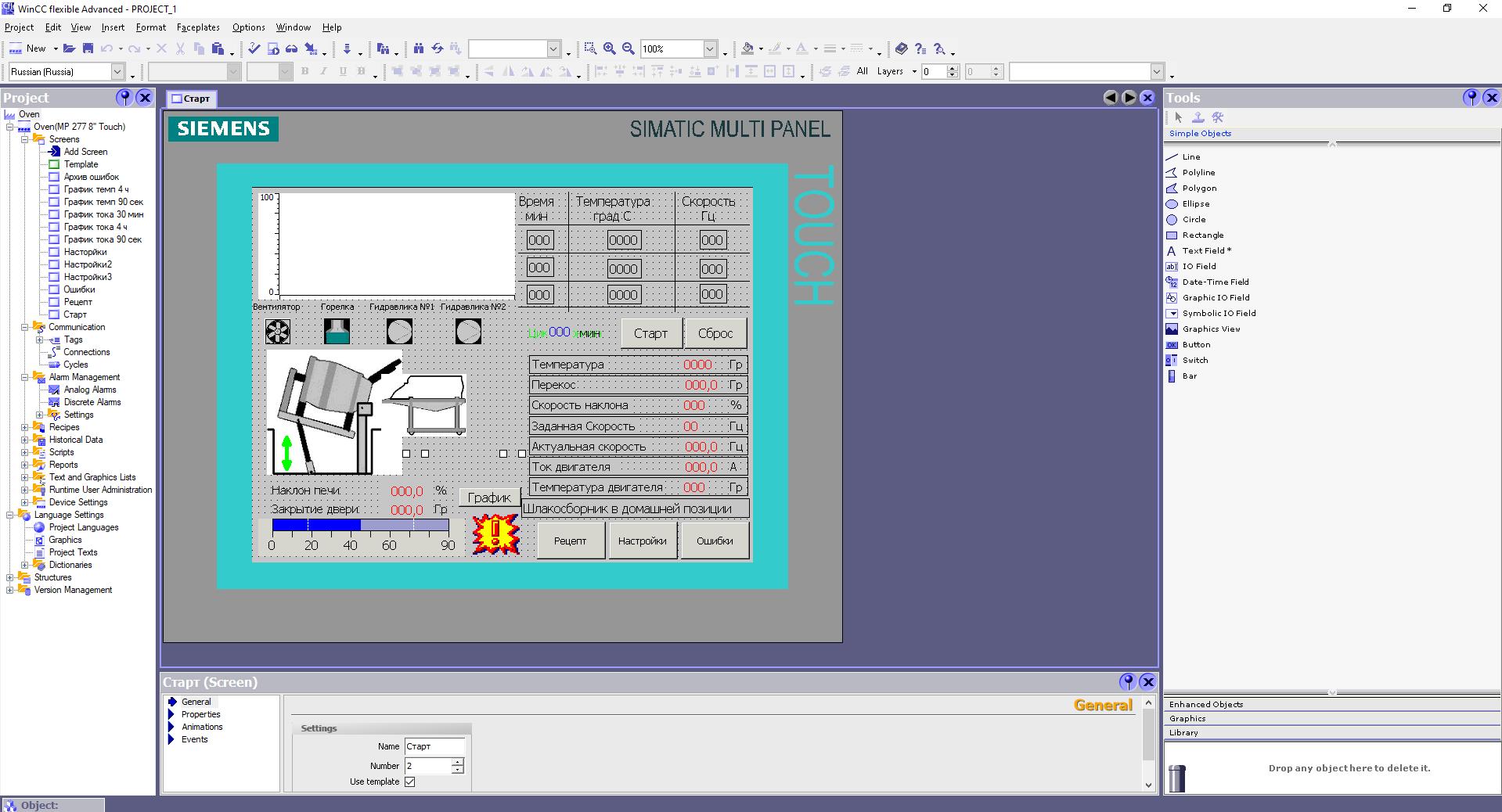 Для возможности управления и контроля процессами в систему TIA Portal встроенна потдержа визуализация процессов. Состав проекта визуализации оговаривается с заказчиком.